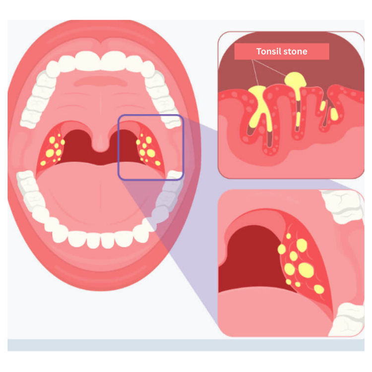Tonsil stones form when food particles, bacteria, and mucus get trapped in the tonsils. Over time, they harden, leading to bad breath, discomfort, and throat irritation.